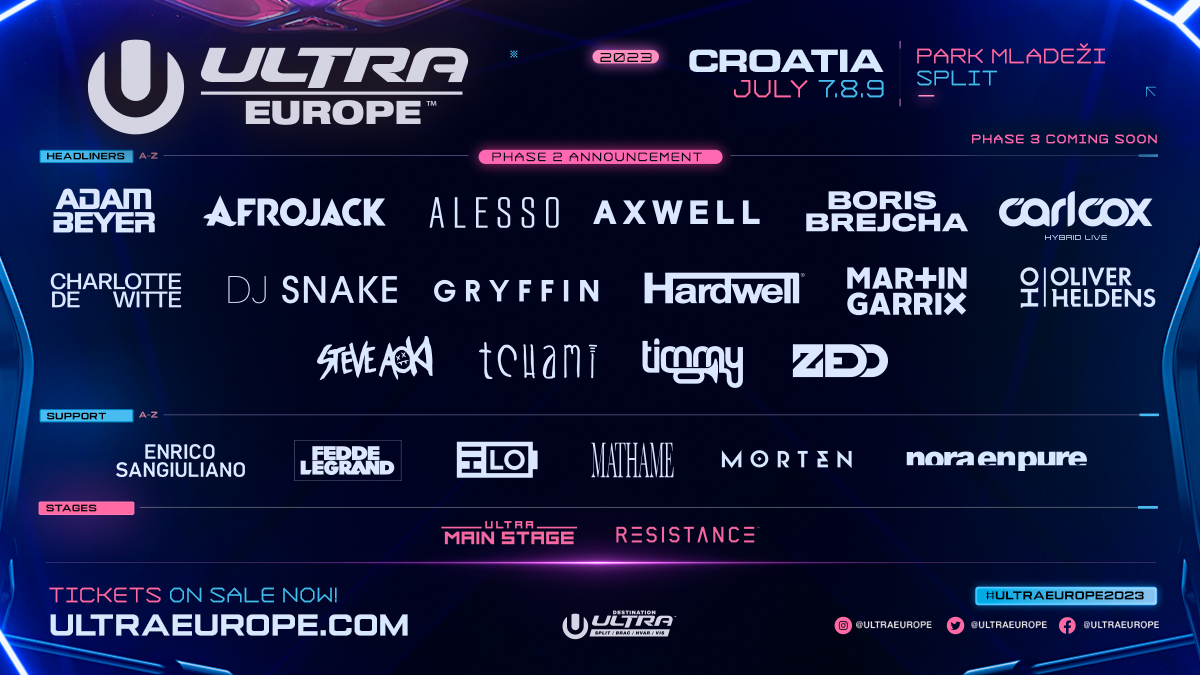2023年7月7日(金)8日(土)9日(日)クロアチアで開催されるUltra Europe 2023のラインナップが発表されました!Adam Beyer、Afrojack、Alesso、Axwell、Charlotte de Witte、Hardwell、Martin Garrix、Steve Aoki、W&W、ZEDDなどが出演します。