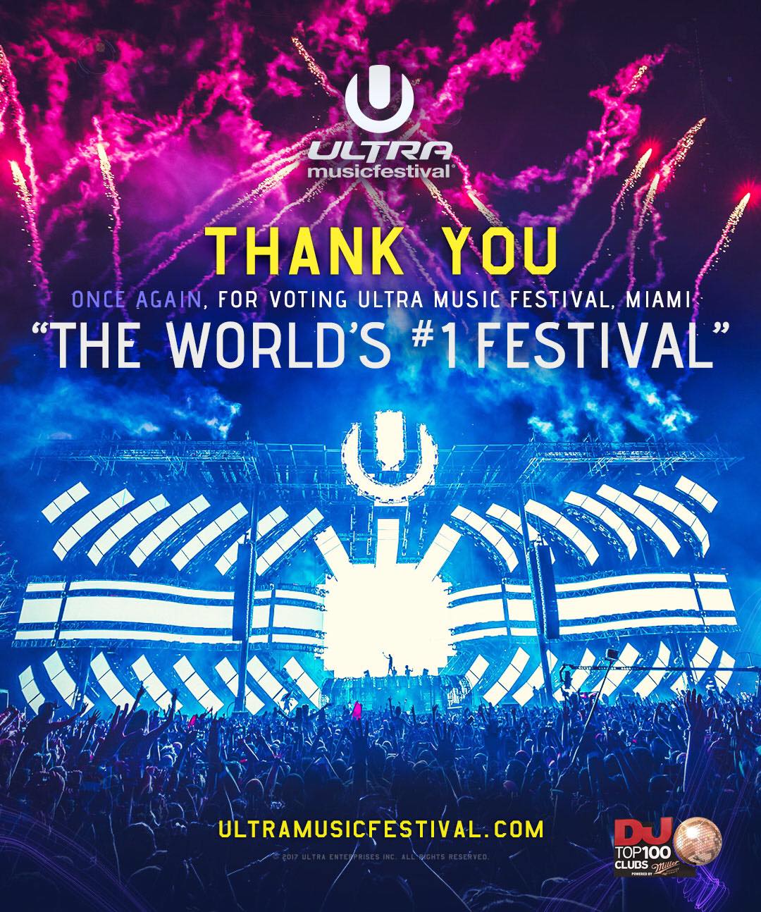 2016年の終わり頃から世界のクラブランキングを決める投票が始まったのを覚えていますか?好きなクラブを5つ選び、最後に好きなフェスを投票したクラブが今回No. 1に選ばれました!それがUltra Music Festivalです。50万人が投票したそうです。